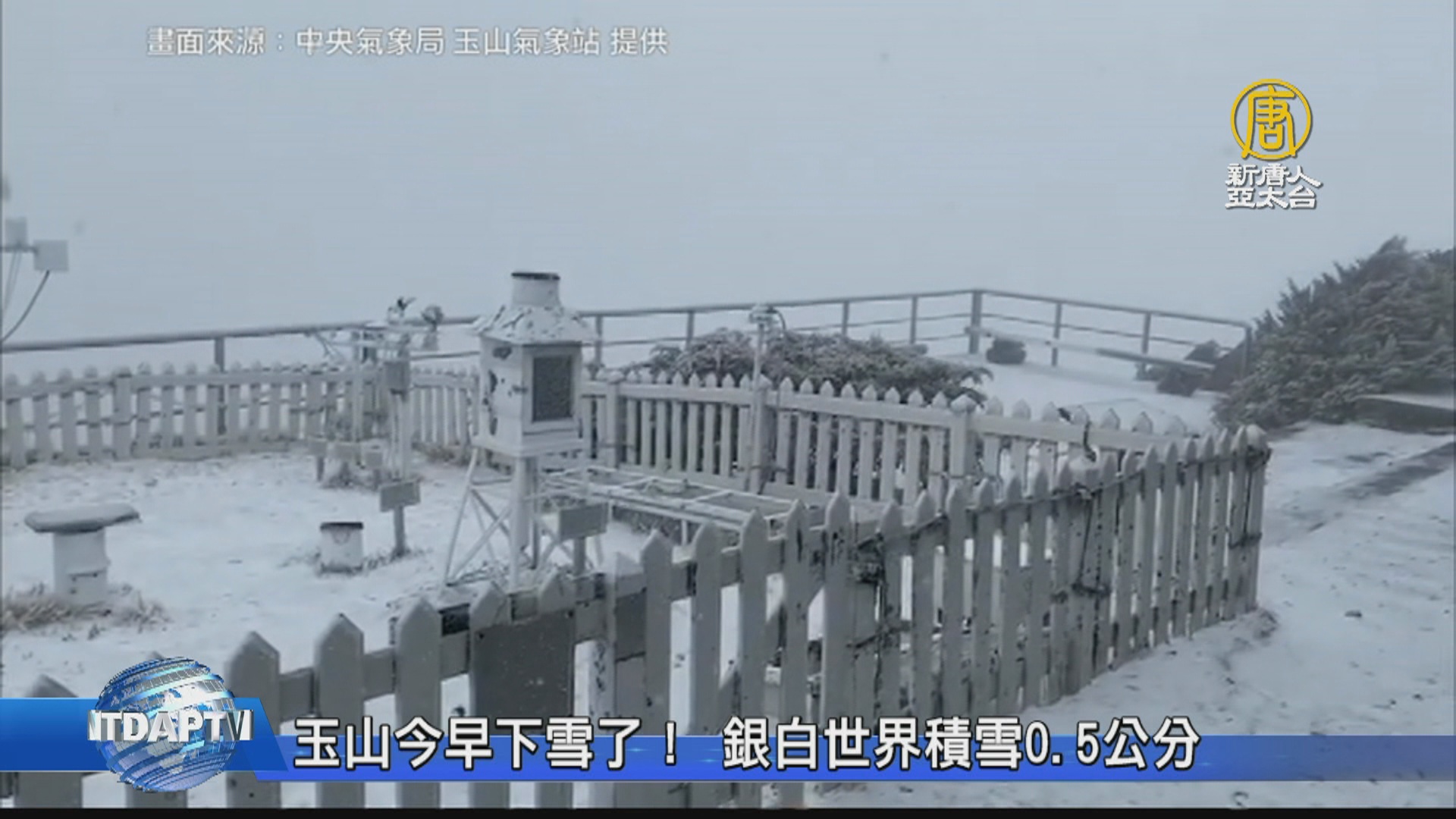 【新唐人亞太台 2022 年 01 月 07 日訊】鏡頭轉回台灣,玉山在今天早上開始下雪!受到東北季風和南方雲系影響,昨晚開始各地水氣增加,氣象局表示,玉山在凌晨2點20分下了一段冰霰,並從今天早上9點開始下雪,累積0.5公分的積雪,地面宛如覆蓋一層白毯,一片雪白美景。預計到周末,水氣會稍微減少,另外氣象達人彭啟明在臉書表示,下周二會有另一波強冷空氣報到,周三北部可能會降到10度低溫,而中南部則相對比較晴朗。