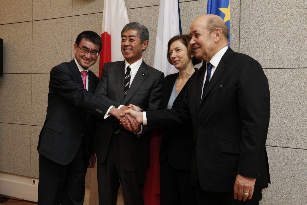 2019年1月11日,日本時任外務大臣河野太郎(左1)、時任防衛大臣岩屋毅(左2)、法國國防部長帕利(右2)、外交部長勒德里安(右1)於法國布雷斯特(Brest)舉行第5次日法2+2會談。(圖/翻攝自推特@florence_parly)