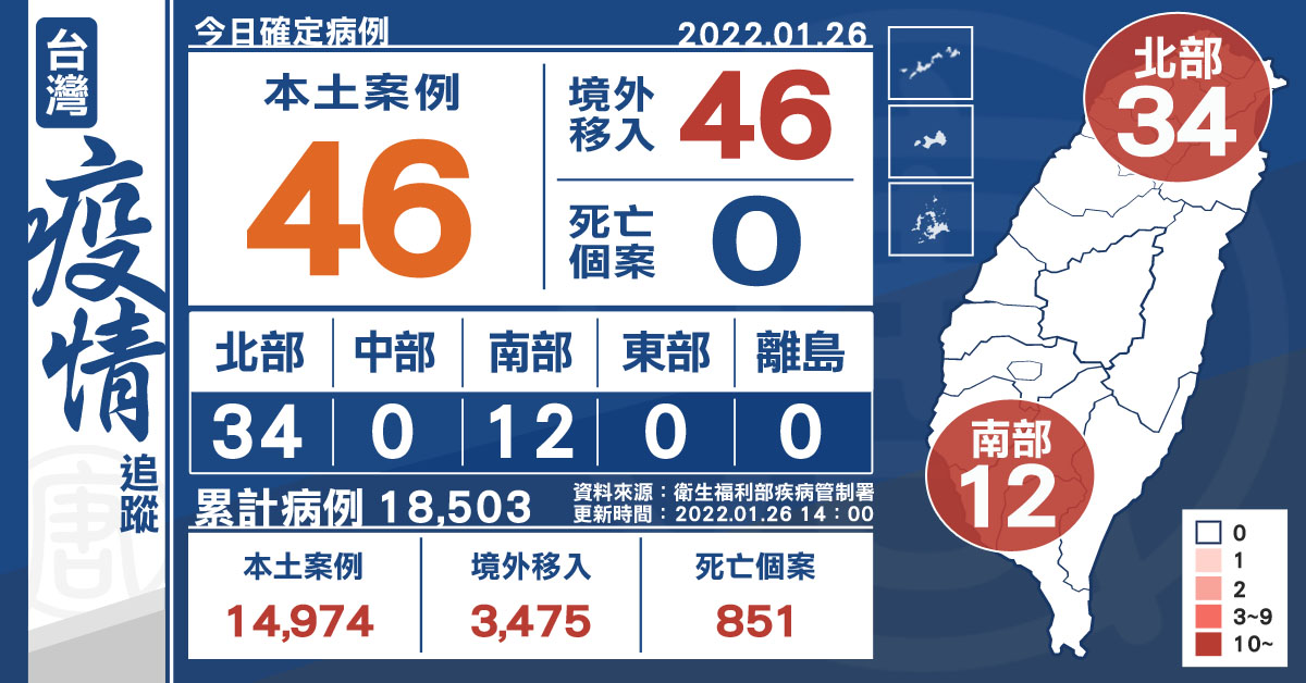 【新唐人亞太台 2022 年 01 月 26 日訊】中央流行疫情指揮中心今(26)日公布國內新增92例COVID-19確定病例,分別為46例本土個案及46例境外移入;另確診個案中無新增死亡。