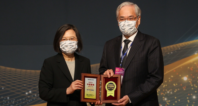總統蔡英文(左)27日下午在台北出席2021年第22屆 NHQA國家醫療品質獎頒獎典禮,頒發2021特優機構 (醫學中心組)獎牌給台北榮民總醫院。右為台北榮總新任院長陳威明。(圖/中央社)
