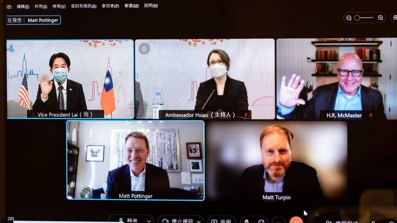 在上午馬不停蹄的視訊交流中,與賴清德深談最久的是美方的國安專家。包括前白宮國安顧問麥馬斯特(H.R. McMaster)、前白宮副國家安全顧問博明(Matthew Pottinger)和前白宮國家安全會議中國事務主任特賓(Matt Turpin)參與對話。