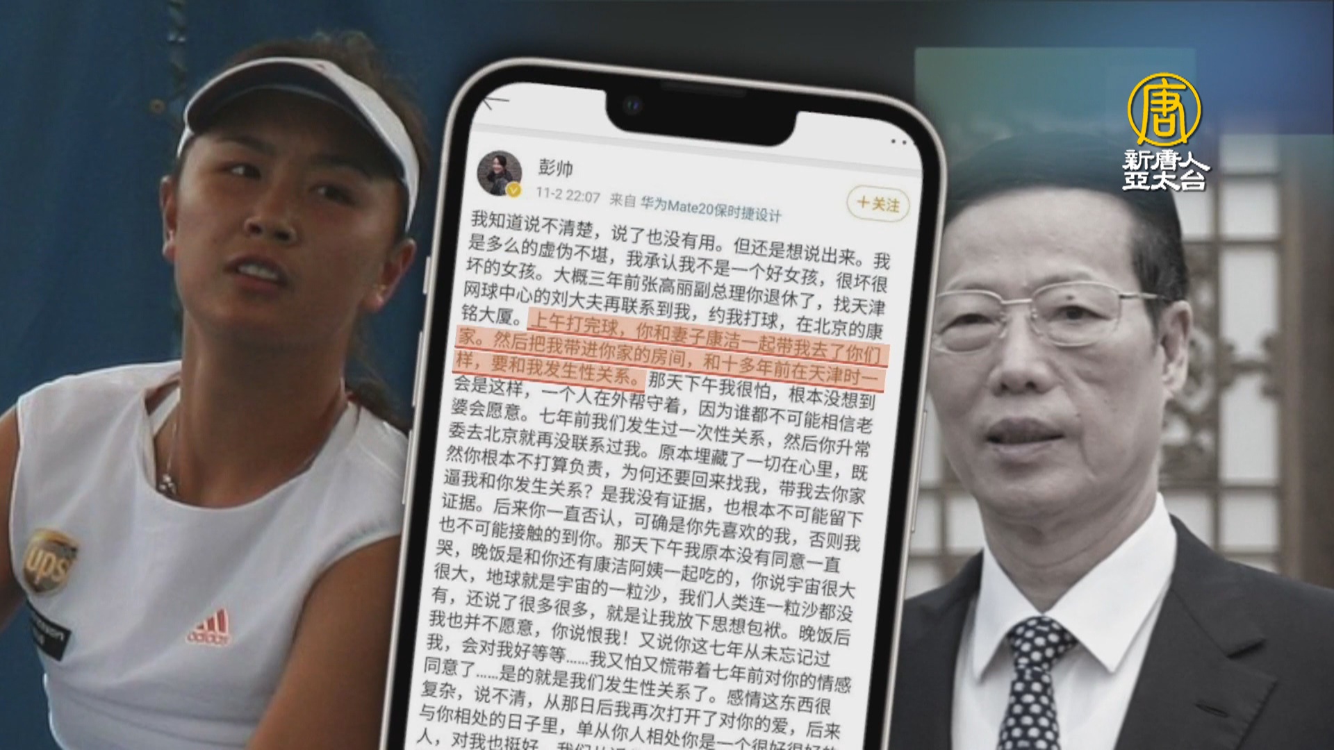 2021-11-03 21:22:16中國知名網球選手彭帥,曾與台灣網球一姊謝淑薇搭檔,兩度拿下大滿貫女雙冠軍,11月2日深夜彭帥在微博爆料,遭大她40歲的前中共副總理張高麗誘騙性侵,張高麗妻子也涉入其中。這篇爆炸性的微博文章發布後,僅20分鐘就遭刪除,中國網友只能用網球英文tennis為關鍵字討論。台灣立法委員也發聲抨擊,呼籲關注中共制度下更多的受害者。