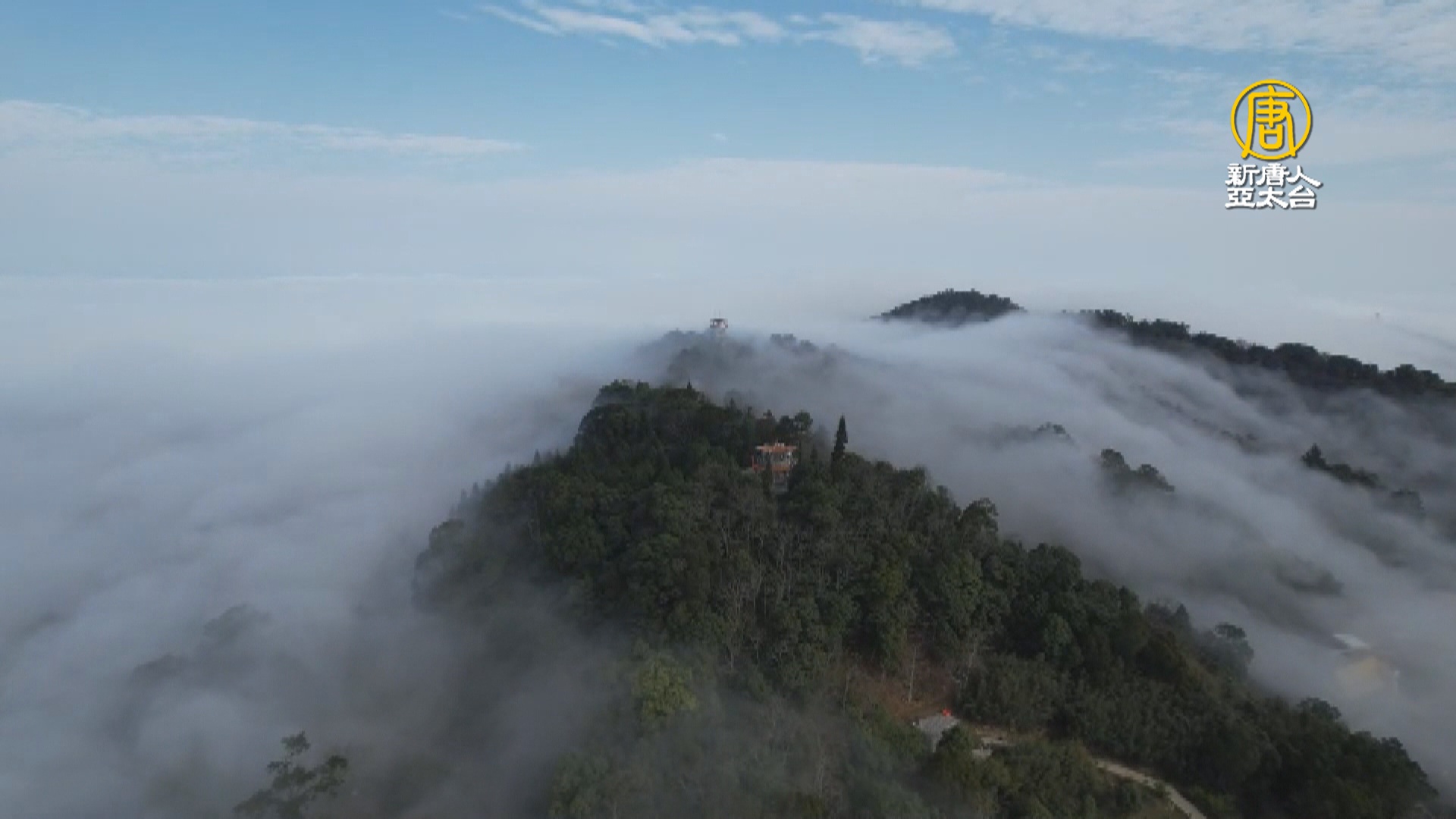 透過空拍畫面,可以看到白色的雲霧宛如瀑布一般,從關刀山稜線傾洩而下,越過薑麻園地區,海拔約800公尺高的關刀山上,只露出最頂端的瞭望台,宛如一座燈塔,但這般美麗景緻,沒有天時、地利看不到。