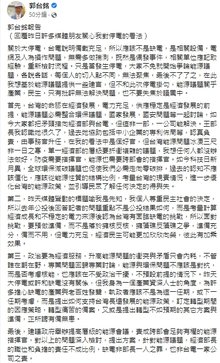 郭台銘今天下午在臉書貼文回應媒體詢問指出,台電說明備載充足,所以應該不是缺電,是相關設備、電網及人為操作問題,無需多做揣測;既然是偶發事件,相關單位應記取經驗,重新檢討流程。