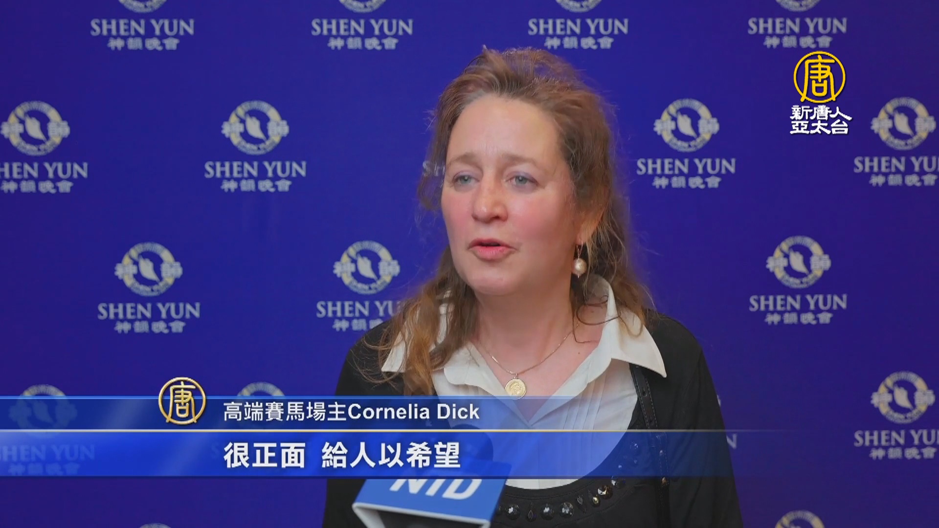 高端賽馬場主Cornelia Dick:「絕美!從藝術角度看,我覺得最棒的是背景動畫。背景動畫的色彩精美至極,和(演員的)服裝搭配的非常協調,色彩對於演出起到了非常好的效果。舞蹈美麗非凡。我曾經跳過芭蕾舞,(神韻舞蹈)展現的是另一個領域,(神韻舞蹈)難度更高,因為包含了高難度的跳躍動作,而傳統的芭蕾舞達不到這個級別。我真心的向每個人推薦(神韻)。」