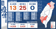 2022-01-25 15:12:37今(1/25)中央流行疫情指揮中心宣布,新增13例本土、25例境外移入,死亡個案則未增加。新增本土個案為4例男性、9例女性,年齡介於未滿5歲至70多歲。