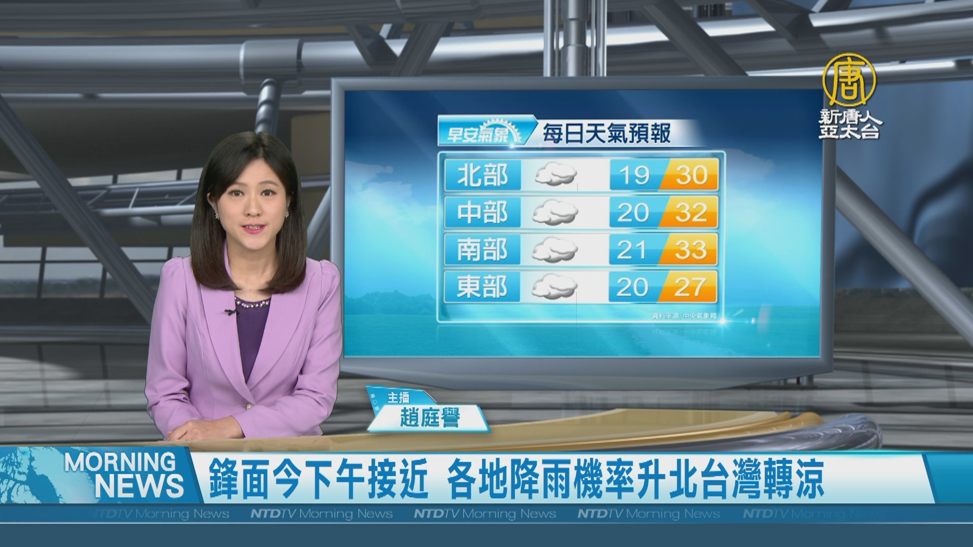 【新唐人亞太台 2022 年 03 月 17 日訊】歡迎您收看3月17日的早安新唐人,我是趙庭譽,先來帶您關心天氣。氣象局表示,今天下午一波鋒面將接近台灣,各地降雨機率提高,提醒觀眾朋友出門記得帶傘。這波鋒面來得快去得快,明天(18日)下午各地雨勢將逐漸趨緩,晚上雨區縮小,後天星期六將會重回好天氣。帶您一起來看到國際媒體重要訊息。