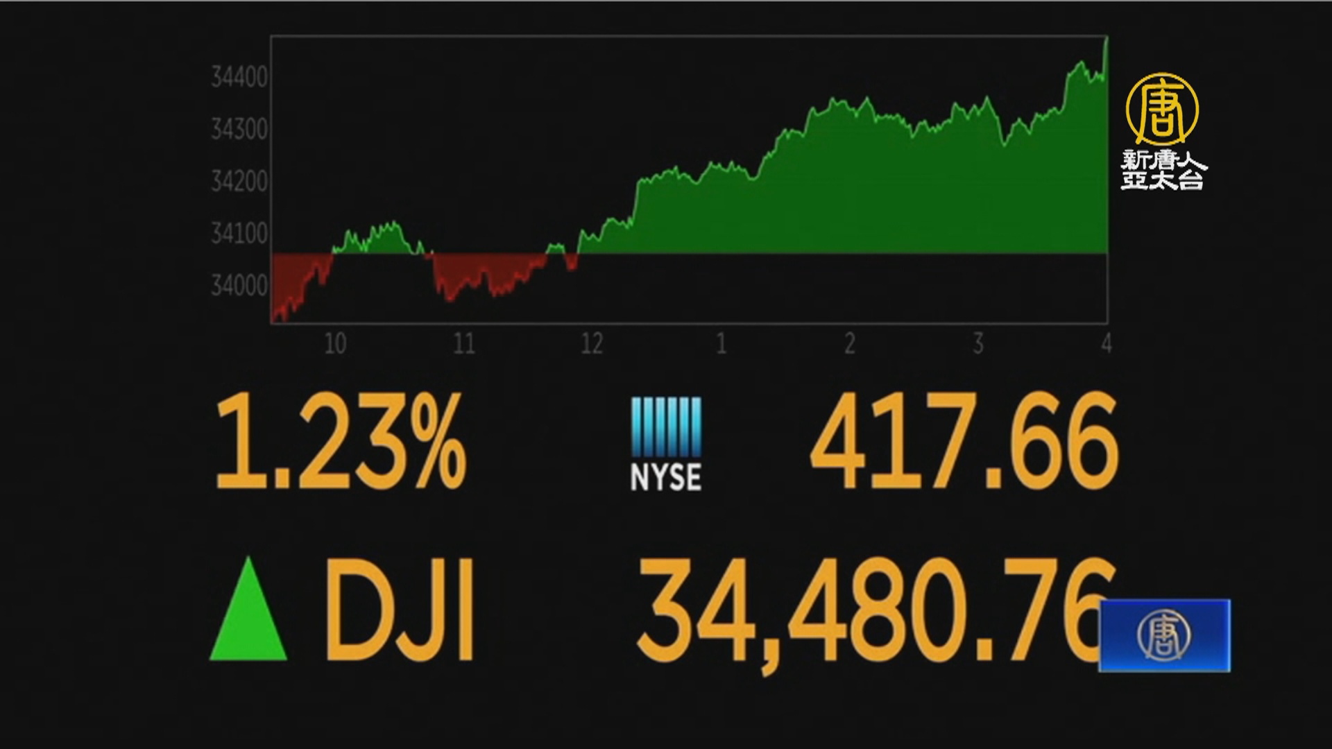 美股道瓊指數上漲 417.66 點,或 1.23%,收 34,480.76 點。