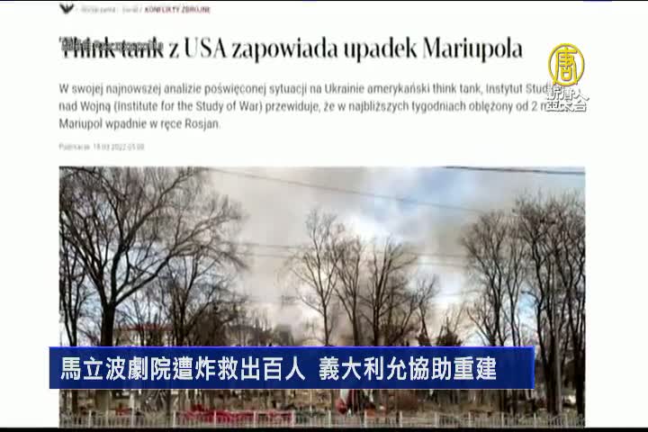 【新唐人亞太台 2022 年 03 月 18 日訊】俄羅斯入侵烏克蘭今天進入第23天,昨天烏克蘭官方公布,有上千人躲避的馬立波劇院遭轟炸,今天(18日)烏克蘭頓內茨克前州長塔魯塔發文表示,躲在當中避難的民眾陸續離開這座建築物,至少130人獲救。另外,烏克蘭國會人權專員德尼索娃表示,那棟建築物在威力強大的空用炸彈攻擊下挺了過來,保護了躲在防空洞的民眾性命。而撬開地下室的作業正在進行。」另外,義大利外長 佛蘭契斯奇尼在推特上寫說:「內閣已經批准提案,盡快向烏克蘭提供重建所需的資源及工具。各國的戲劇院都屬於全人類。」目前,俄羅斯依舊否認襲擊這座戲劇院。