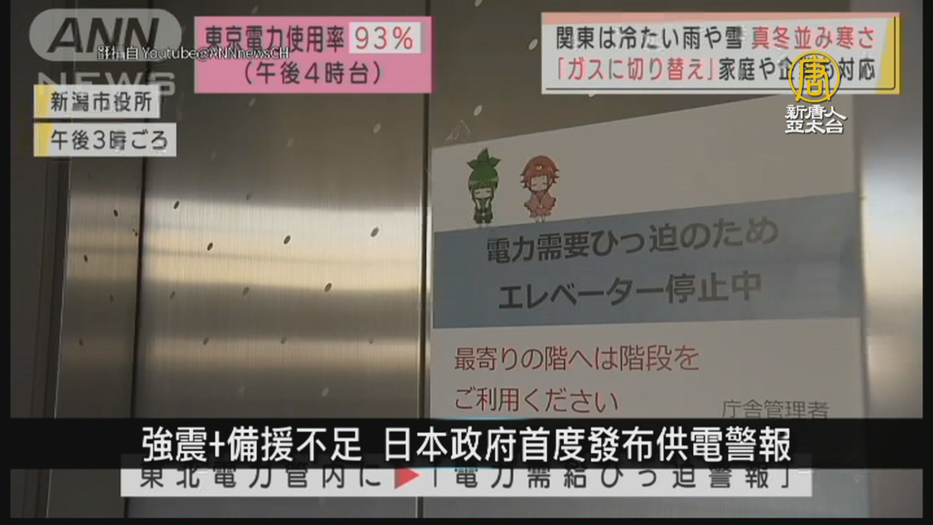 日本福島縣外海16日晚間發生規模7.4強震,導致部分發電機組停機尚未恢復供電,但22日起寒流來襲致氣溫大降,面臨使用暖氣等用電需求上升。日本政府21日首度發布「供電吃緊警報」請民眾省電,範圍涵蓋東京都等9地區,22日上午電力使用率一度達到103%;另外,東北電力使用率也達到98%,追加列入警報。