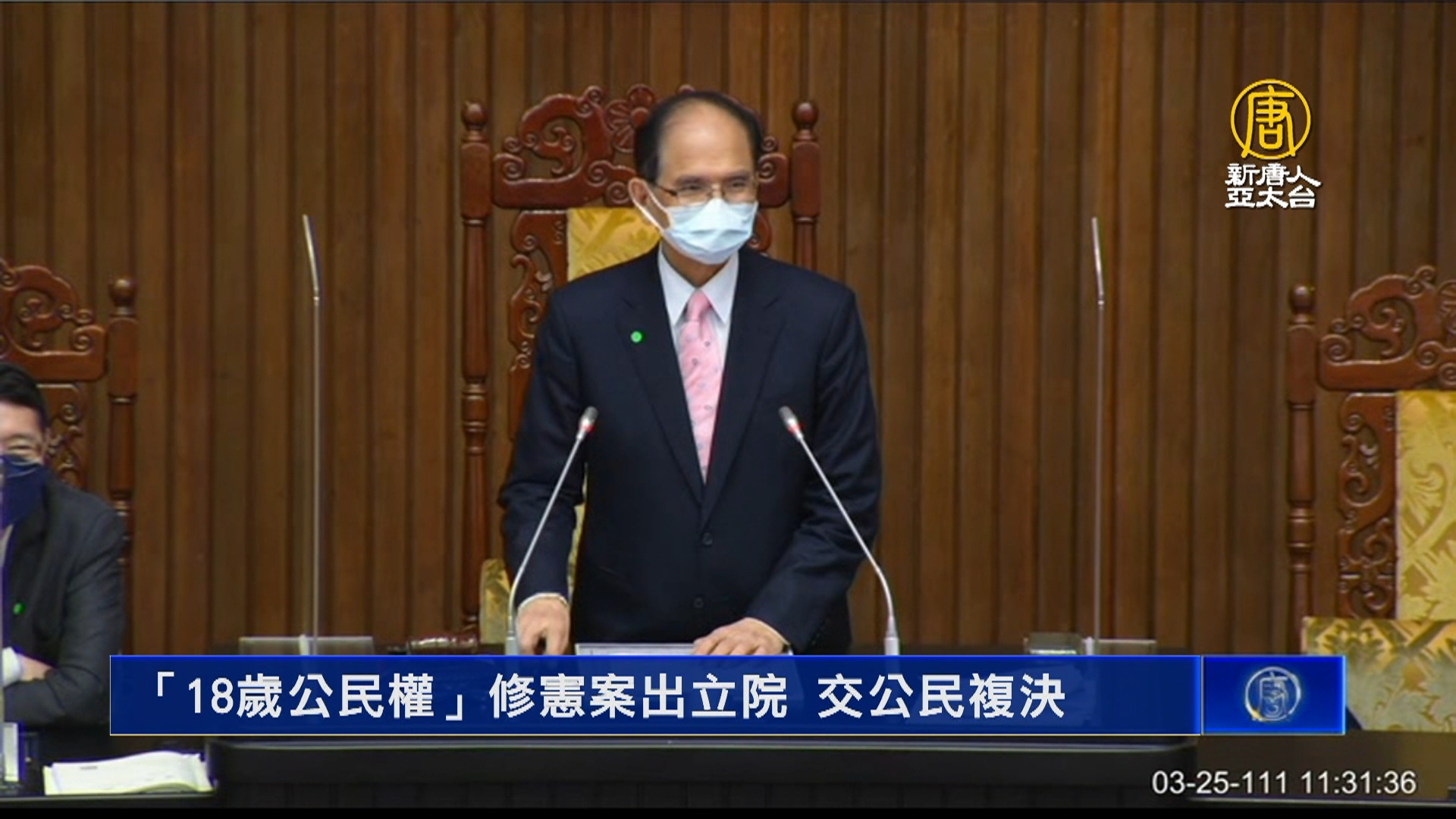 【新唐人亞太台 2022 年 03 月 25 日訊】史上第八次修憲,看到成功曙光!立法院今天表決109人投贊成票,通過了修憲草案,也就是所謂「18歲公民權」,但在通過後,還需要公告半年,並舉行公民複決,也就是要有過半選舉人同意,要有965萬票才算通過,至於是否合併年底九合一大選,中選會表示將提委員會審議決定。