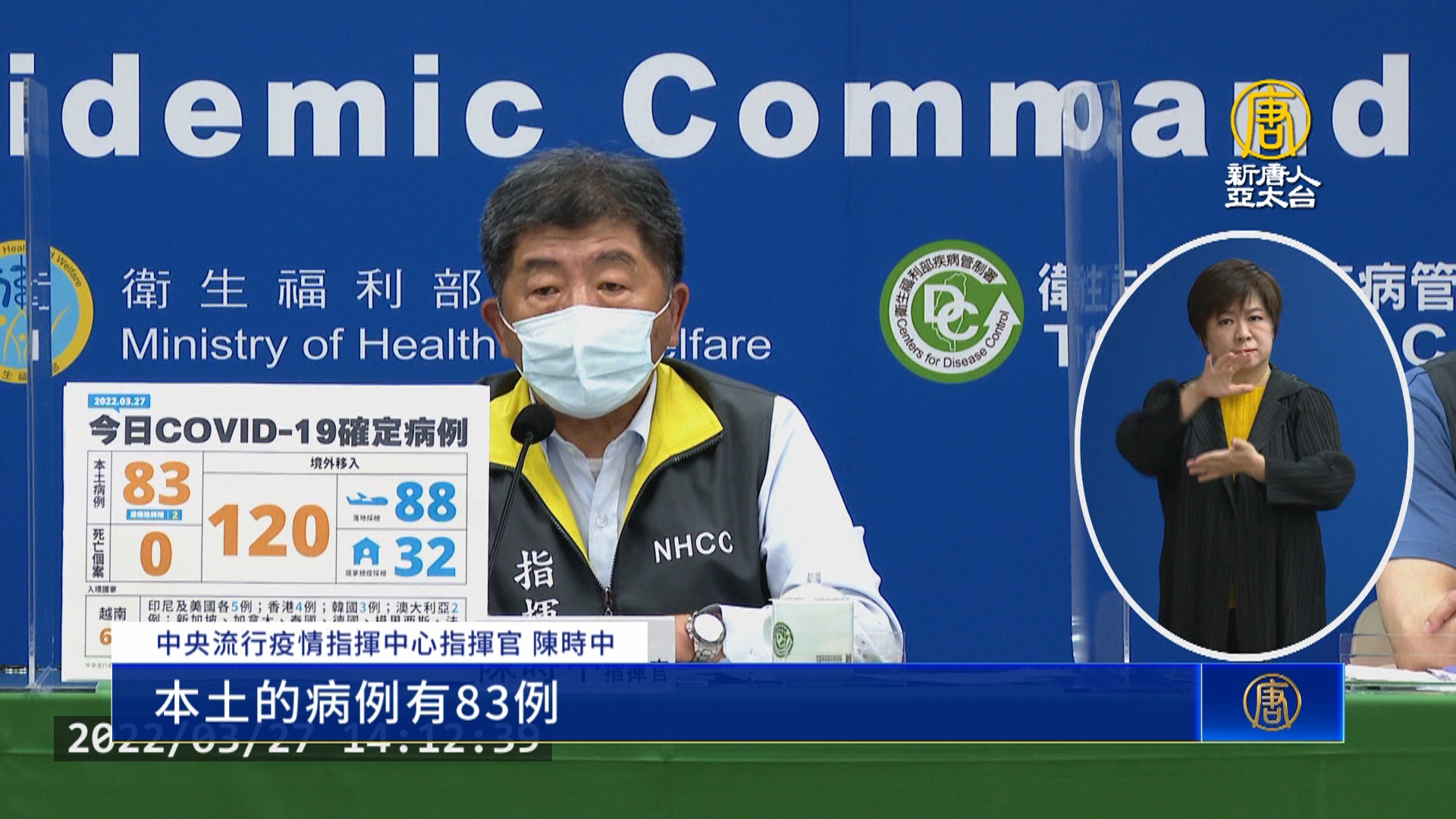 【新唐人亞太台 2022 年 03 月 27 日訊】好的,27號,台灣的境外移入個案來到120例,而本土則一口氣新增83人確診,創下去年6月以來最高,其中桃園大潭電廠的群聚案就有52人染疫,目前感染源不明。