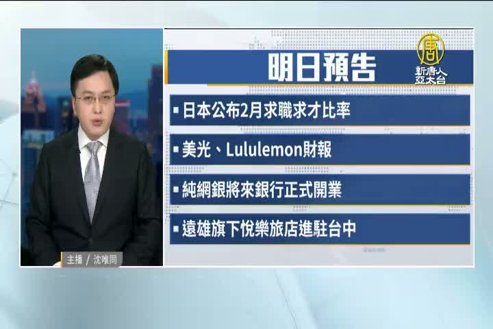【新唐人亞太台 2022 年 03 月 28 日訊】接著帶您看到明天3月29日,星期二,有哪些重要的財經活動。日本公布2月求職求才比率。DRAM大廠美光與加拿大服飾品牌Lululemon公布財報。純網銀將來銀行正式開業。遠雄旗下的悅樂旅店進駐台中。