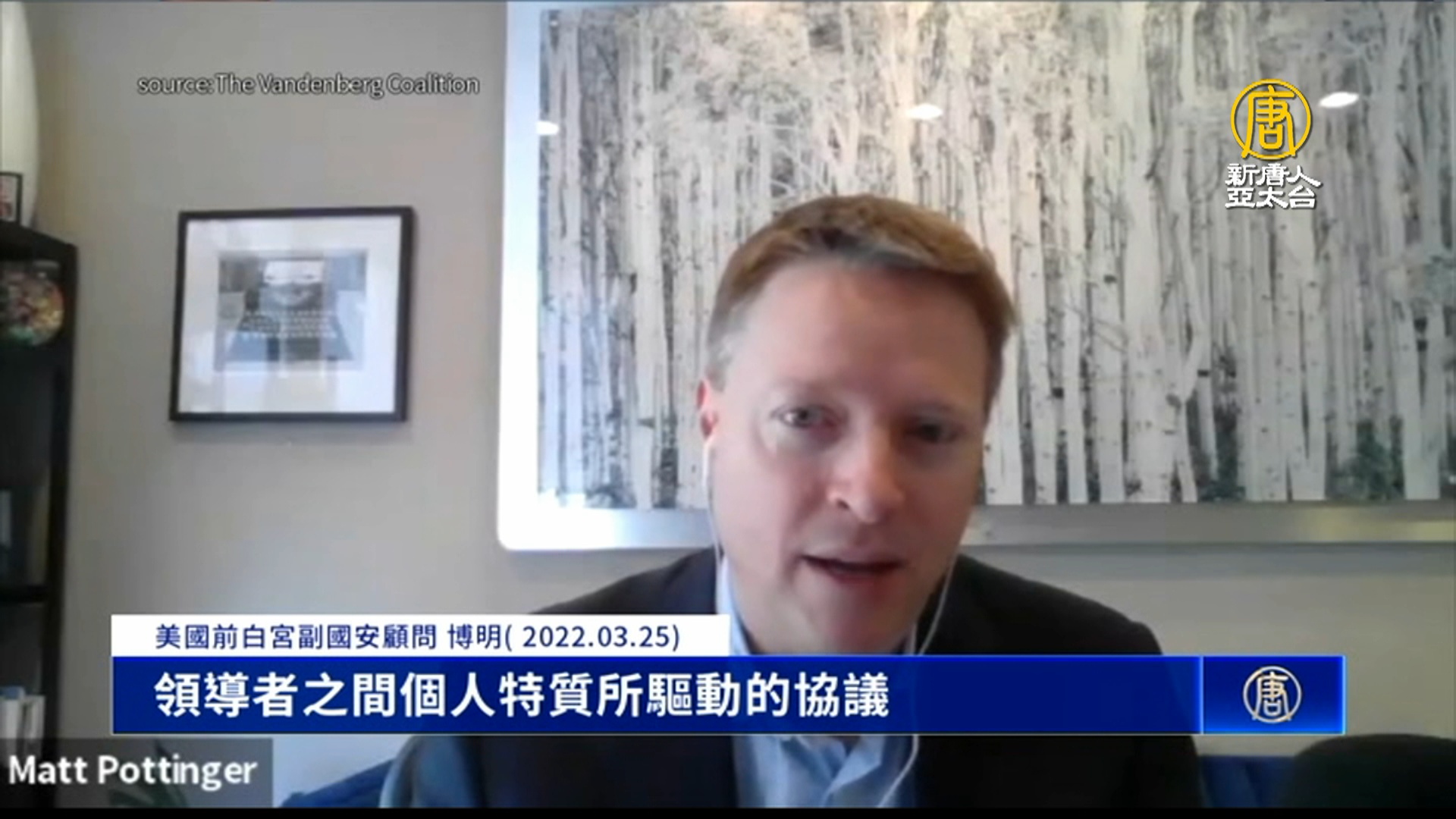 美國前白宮副國安顧問 博明(Matthew Pottinger,2022.03.25):「在許多方面這不是天生的聯盟。它是由上而下的,由領導者之間個人特質所驅動的協議。你所需要做的是,把他們拉得越來越近,讓他們承擔彼此行為的後果,讓他們一方都為對方行為承擔責任。這就是你最終創造空間以分開兩者的作法;而且可能要等到兩人都真正離開。我們需處理中(共)國正向俄方承保提供,它為俄方在歐洲戰爭提供各種宣傳、國際干預及頂級掩護。」「最終我懷疑習近平將無法自拔,他已全力投入這路徑。習近平將嚴重受傷,由於普丁在烏克蘭的失敗;因此我認為習將力助扭轉戰爭的負向軌跡,試圖在俄羅斯努力後面獲取氣勢動能。我們必須確保他失敗且敗得驚人,確保追究中共和俄方的責任。」