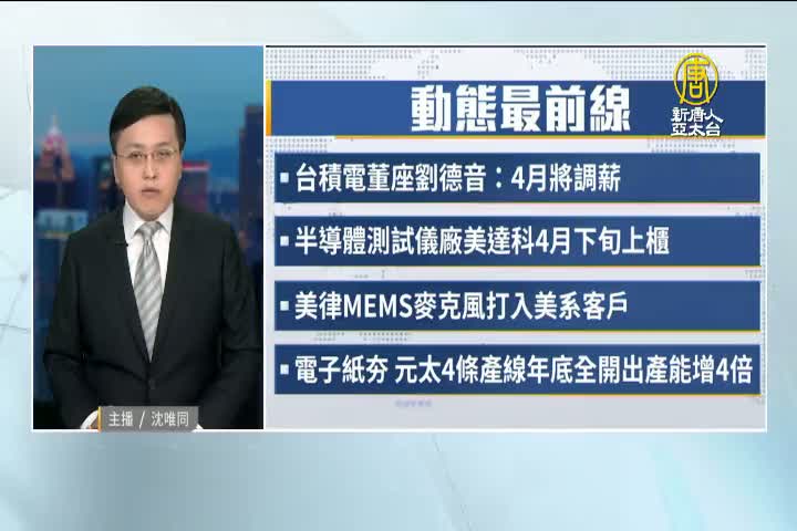 【新唐人亞太台 2022 年 03 月 30 日訊】帶您看到今天的產業動態。台積電董事長劉德音表示,4月將調薪;半導體測試儀廠增添新兵,美達科4月下旬將上櫃;美律MEMS麥克風打入美系客戶,今年營收成長有望飆6成;電子紙綠色商品夯,元太董事長表示,4條產線年底全開出,產能將增加4倍。