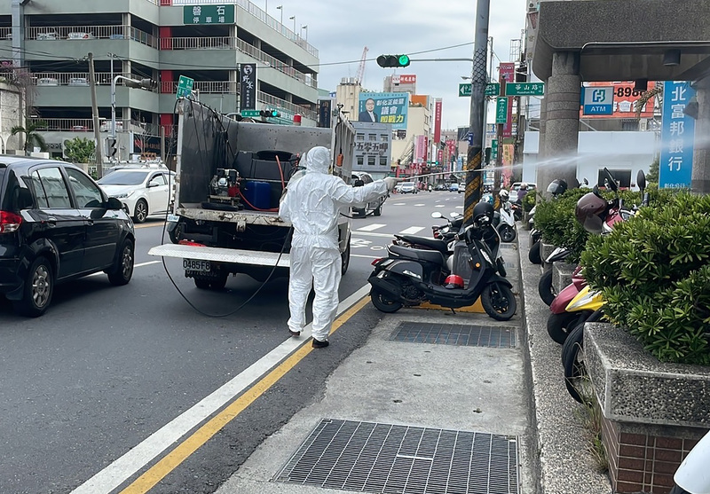彰化縣1日新增多例確診,縣府並公布位於彰化市中山路二段的台北富邦銀行彰化分行有確診者足跡,市公所已派員加強環境清消。 (圖/彰化市公所提供)