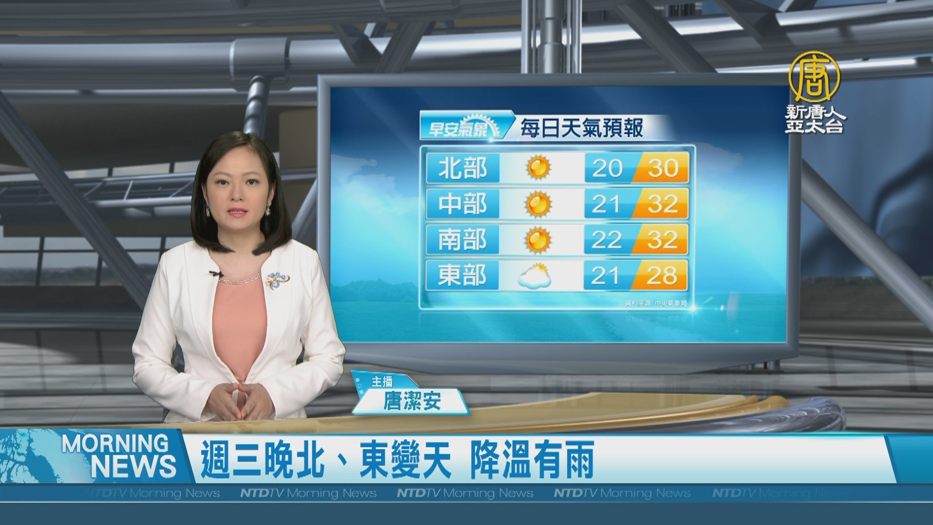 【新唐人亞太台 2022 年 04 月 13 日訊】歡迎您收看4月13日的早安新唐人,我是唐潔安,先來帶您關心天氣。今天白天和昨天一樣溫暖炎熱,不過,晚上將有鋒面通過,東北季風也會增強,中部以北將有感降溫,轉為有雨天氣,低溫下探17度,星期五、星期六,北部東部有局部短暫雨,一直要到17號下週日,才會恢復到多雲到晴。帶您一起來看到國際媒體重要訊息。