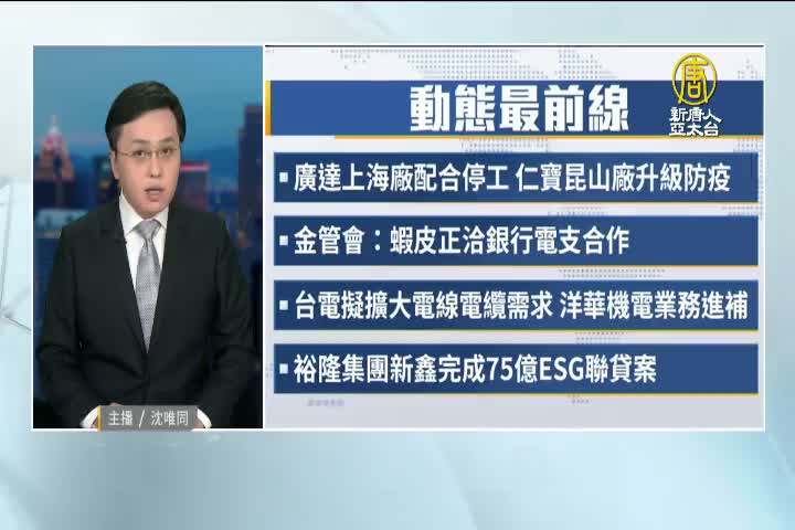 【新唐人亞太台 2022 年 04 月 13 日訊】帶您看到今天的產業動態。中國疫情持續延燒,廣達上海廠配合停工,仁寶昆山廠則是升級防疫措施。蝦皮金流再爆爭議,金管會今天表示:蝦皮正洽銀行電支合作。台電擬擴大未來3年電線電纜需求,洋華機電業務進補。裕隆集團旗下企業金融事業單位新鑫公司,今天完成75億ESG聯貸案。