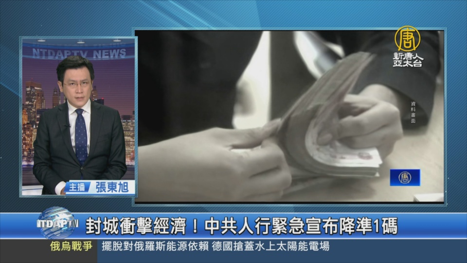 【新唐人亞太台 2022 年 04 月 15 日訊】中國疫情嚴峻,上海、昆山持續封城,嚴重衝擊中國經濟。中國媒體報導,中共人行傍晚宣布,從4月25號開始,下調金融機構存款準備金率0.25個百分點,共計釋放長期資金人民幣5300億元,約新台幣2.4兆。這是中國今年第一次降準,距離上一次降準僅僅相隔4個月。