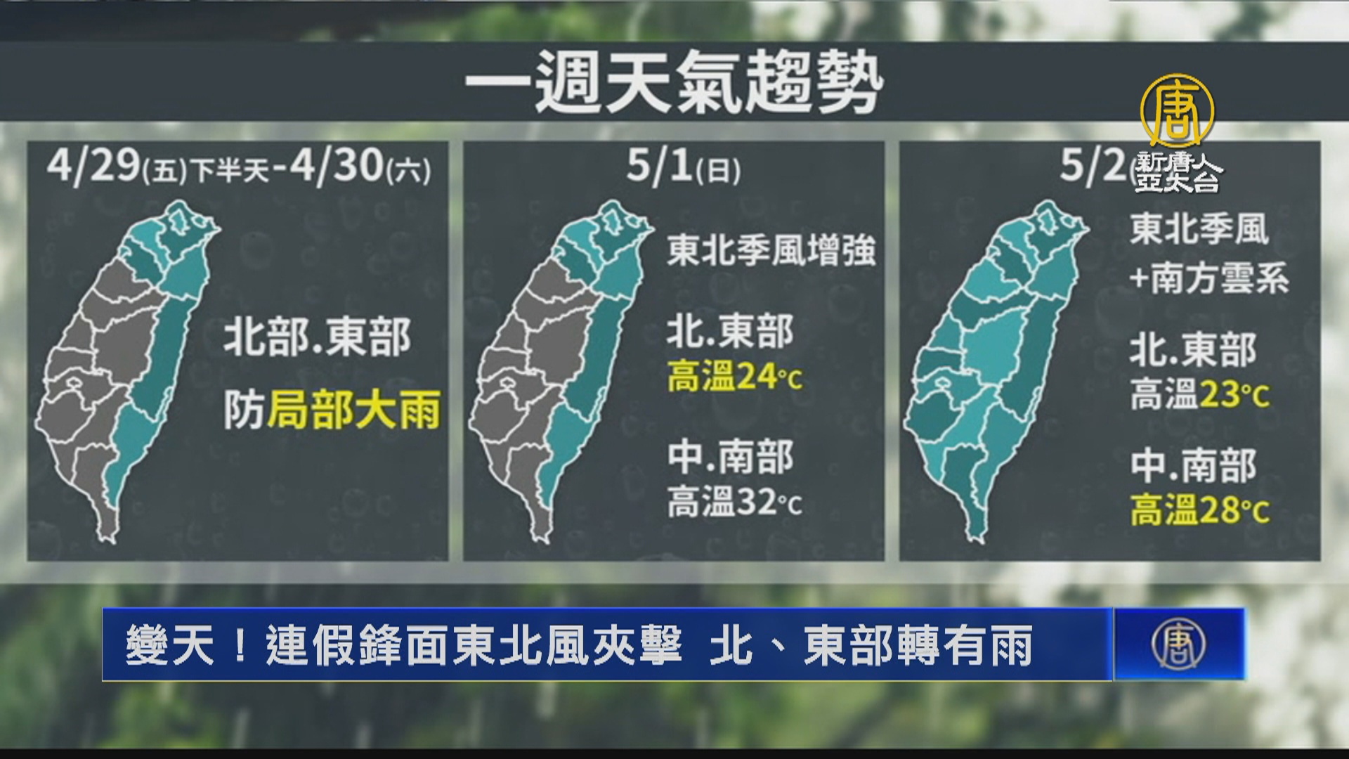 【新唐人亞太台 2022 年 04 月 29 日訊】來關心天氣,受到鋒面通過影響,今天下半天北部及東部,轉為有雨,接著五一連假又碰上東北季風增強,加上南方雲系北台,北、東的還將轉涼,高溫只剩24度左右,中南部週一開始也將開始下雨。氣象局預估即將到來的梅雨季,雨量正常偏少,但降雨時間變得更集中,更容易致災。
