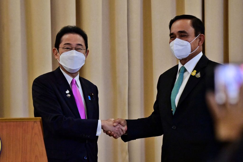 日首相岸田文雄(圖左)2日在泰國與泰總理帕拉育(Prayut Chan-o-cha)進行領袖會談。兩國2日簽署「防衛裝備品暨技術轉移協定」,讓日本出口防衛裝備品到泰國成為可能,在日泰安全保障領域強化合作的意圖。(圖/GettyImages)