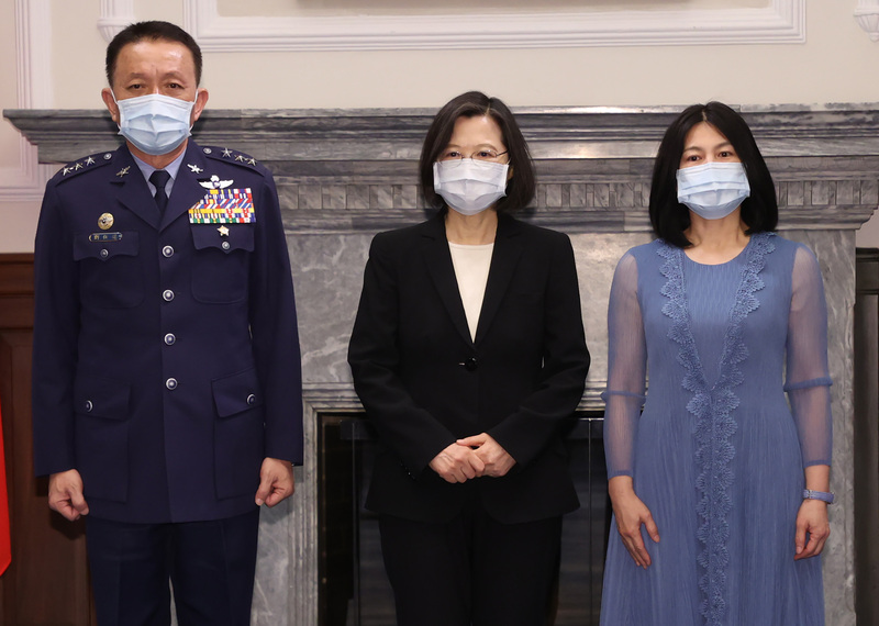 總統蔡英文(中)3日在總統府主持國軍重要高階幹部授勳暨晉任布達授階典禮,與新任空軍司令劉任遠 (左)伉儷合影。(圖/中央社)