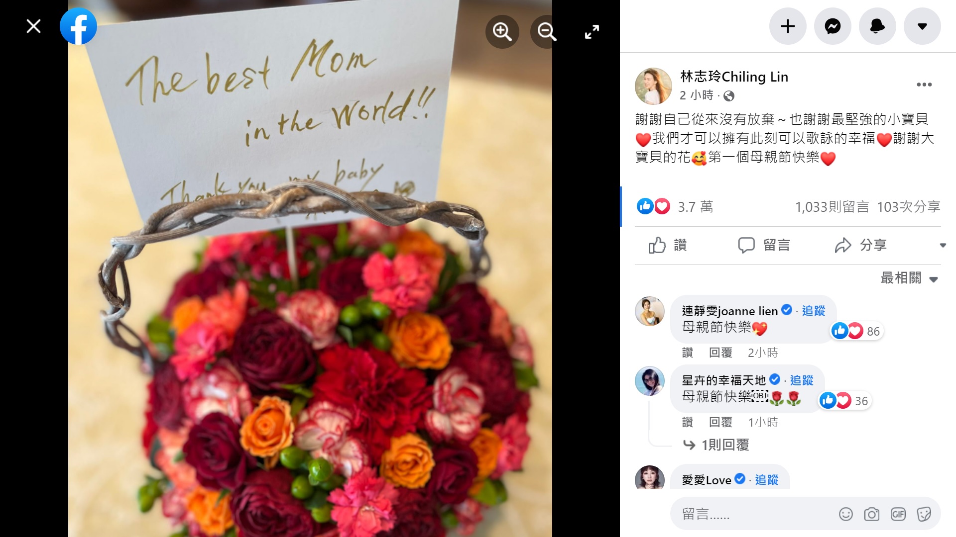 林志玲同時發文感謝自己從未放棄,「也謝謝最堅強的小寶貝,我們才可以擁有此刻可以歌詠的幸福。謝謝大寶貝的花。第一個母親節快樂。」網友也紛紛留言送上祝福。