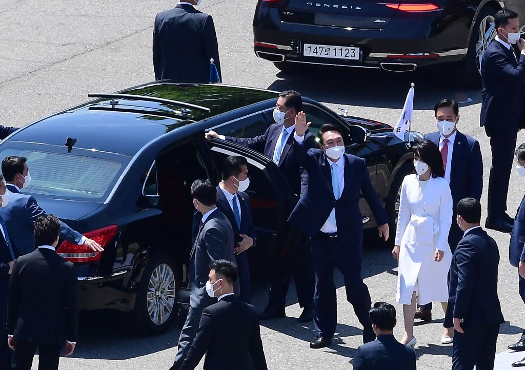 韓國第20屆總統就職典禮今天在位於首爾市汝矣島的國會大樓前進行,穿著黑色西裝、打上天藍色領帶的新任總統尹錫悅首次與妻子金建熙出席公開活動,從一早參拜行程就陪伴在尹錫悅身邊的金建熙則換下黑色套裝,穿著一襲白色套裝出席就職典禮。