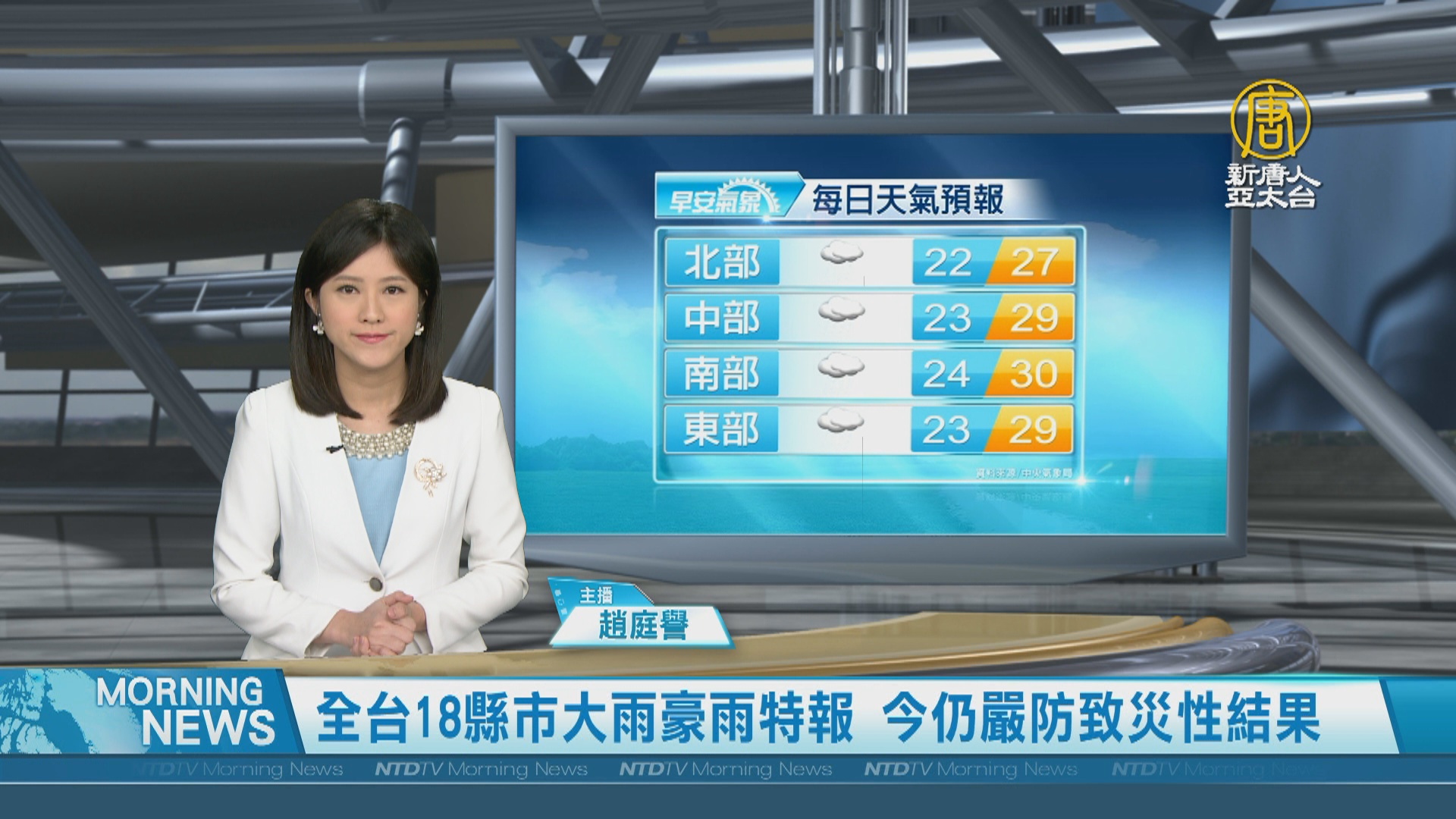 【新唐人亞太台 2022 年 05 月 26 日訊】歡迎您收看5月26日的早安新唐人,我是趙庭譽,先來帶您關心天氣。今天鋒面仍在台灣上空,各地整天都有降雨情形,氣象局針對基隆、新北、桃園發布豪雨特報,另外對15個縣市發布大雨特報,雨勢預估要持續到禮拜五下半天之後才會比較緩和,這段期間務必留意溪水暴漲,山區請慎防坍方、落石。帶您一起來看到國際媒體重要訊息。