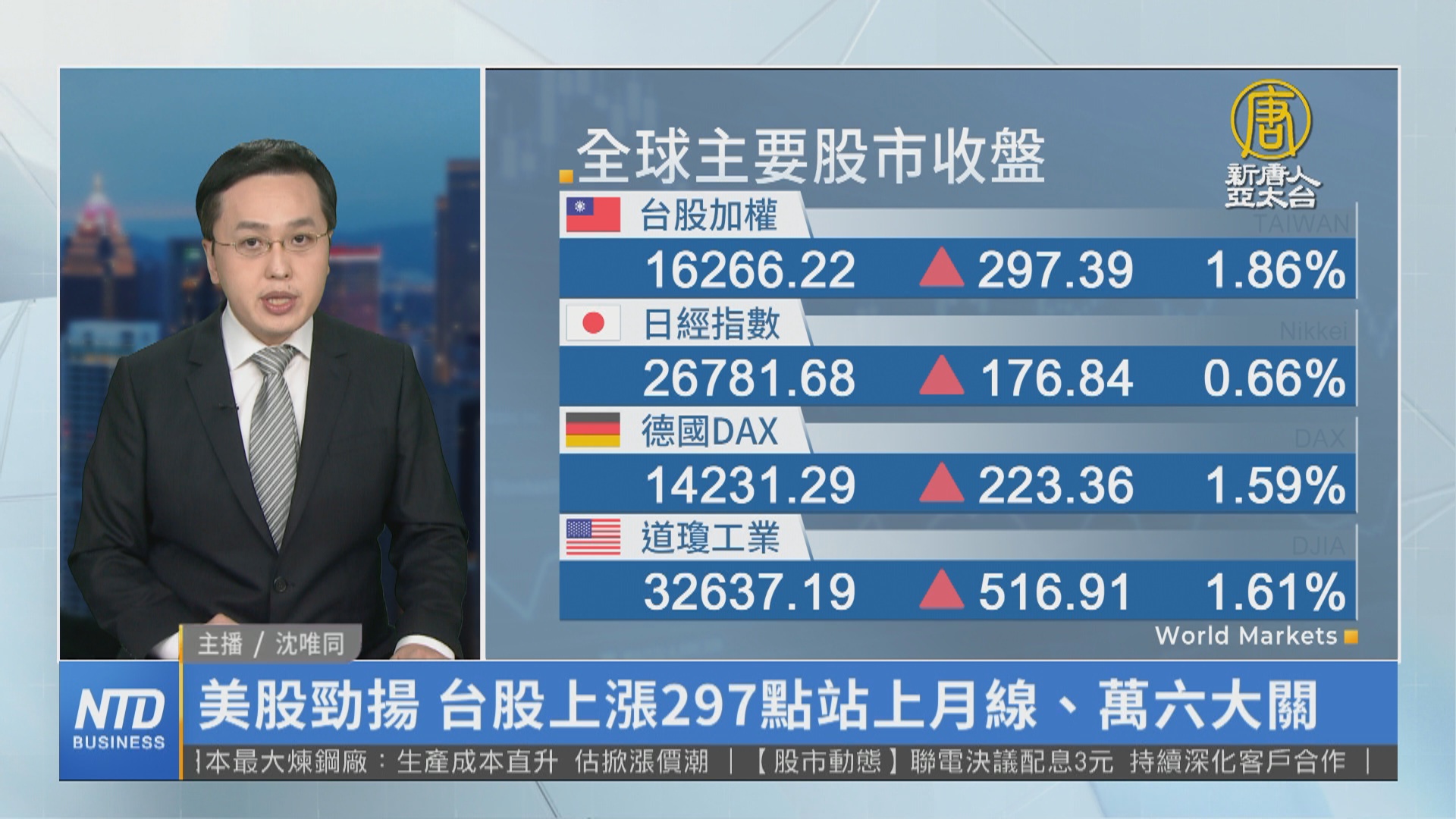 【新唐人亞太台 2022 年 05 月 27 日訊】新聞一開始帶您關心國際股市,由於美國零售業財報優於預期,加上市場對美國聯準會激進升息的疑慮消退,美股大幅走高,道瓊工業指數上漲516點,標普500指數漲了近2%,那斯達克,和費城半導體也強漲超過2.6%。而台股在美股大漲的激勵下,電子、金融與傳產同步喊衝,指數開高走高,終場收在16266點,上漲近300點,創下近7個交易日收盤新高。