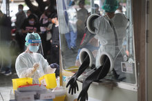 指揮中心已與經濟部討論,將在近期宣布商務人士邊境鬆綁措施。圖為新北聯醫三重院區PCR採檢區醫護人員忙為民眾採檢。(圖/中央社)