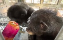 聰明的胭脂猴還將冰棒折斷成容易的入口大小;保育員則將三色水果千層冰擊碎成小塊,讓年長的黑熊「瑪莉」更方便食用。