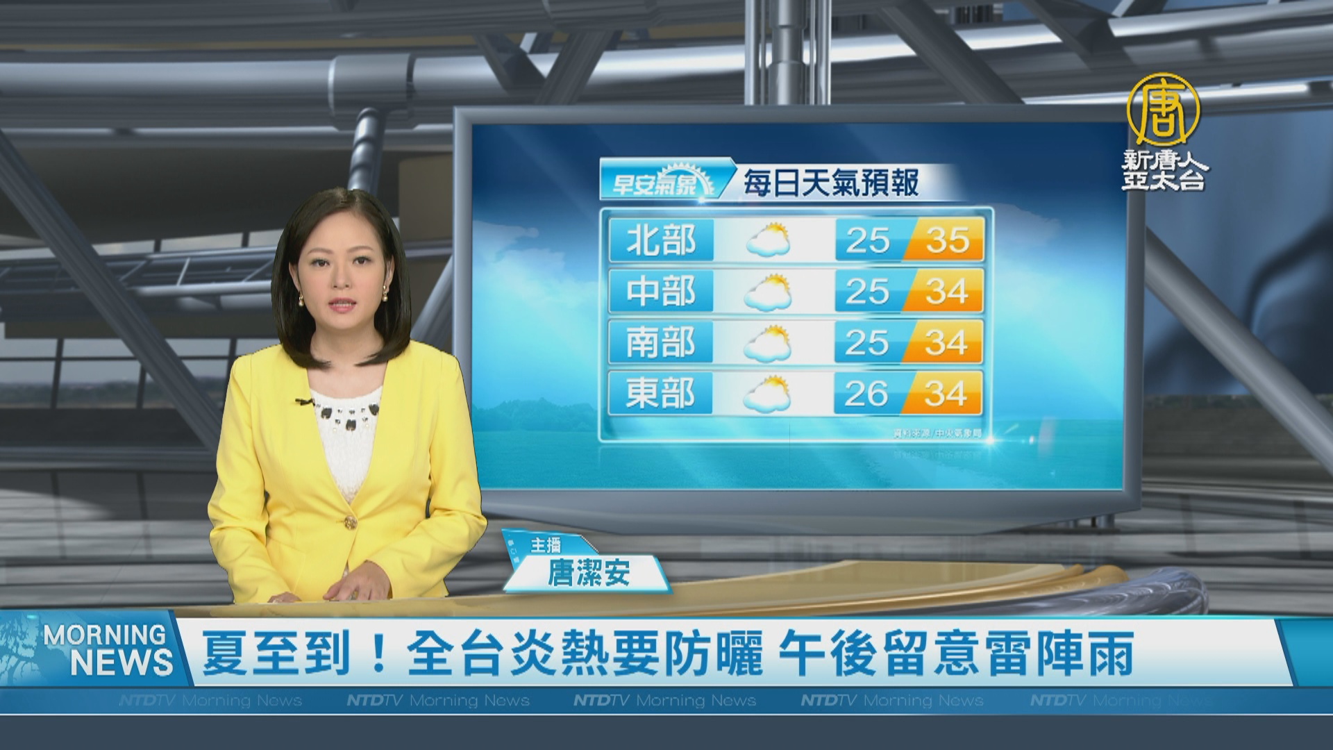 【新唐人亞太台 2022 年 06 月 21 日訊】歡迎您收看6月21日的早安新唐人,我是唐潔安,先來帶您關心天氣。今天是24節氣中的「夏至」,受到太平洋高壓增強影響,今天全台各地大致上都是高溫炎熱的天氣,提醒觀眾朋友,外出時建議多補充水分並做好防曬;大台北地區、東北部及山區可能出現午後雷陣雨。帶您一起來看到國際媒體重要訊息。