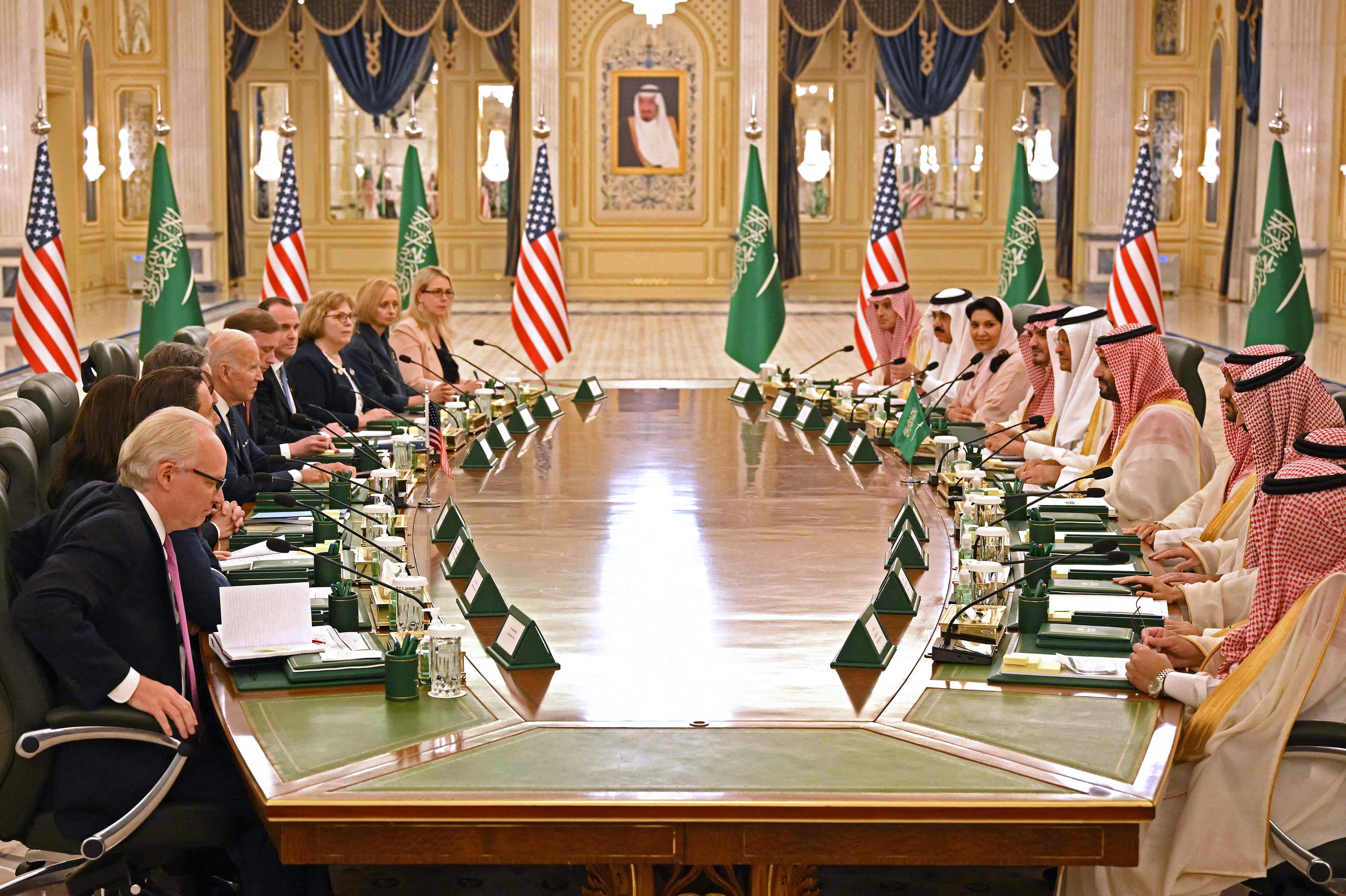 美國總統拜登15日拜訪沙烏地阿拉伯,與實際掌權的王儲穆罕默德.沙爾曼等官員進行會議。(圖/GettyImages)