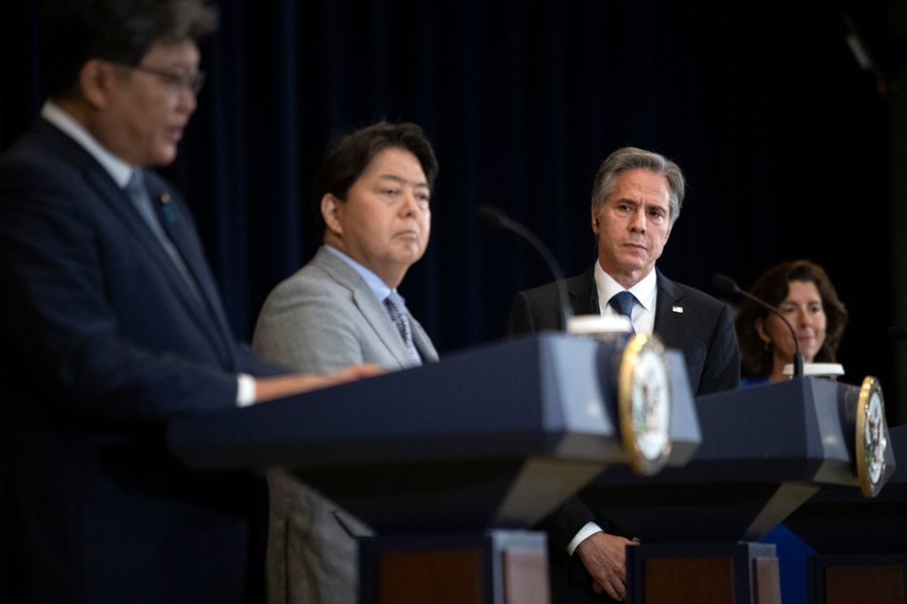 國國務卿布林肯(右2)30日表示,美方政策不變,強烈反對任何片面改變現狀或破壞台海和平穩定的作為。日本外務大臣林芳正(左2)則重申美日5月聯合聲明表示,對台基本立場不變。(圖/GettyImages)
