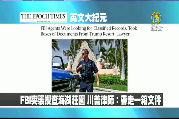 【新唐人亞太台 2022 年 08 月 10 日訊】首先來看到美國大紀元英文版報導:FBI突襲搜查海湖莊園,川普律師表示,FBI帶走一箱文件,為尋找某些機密檔案。