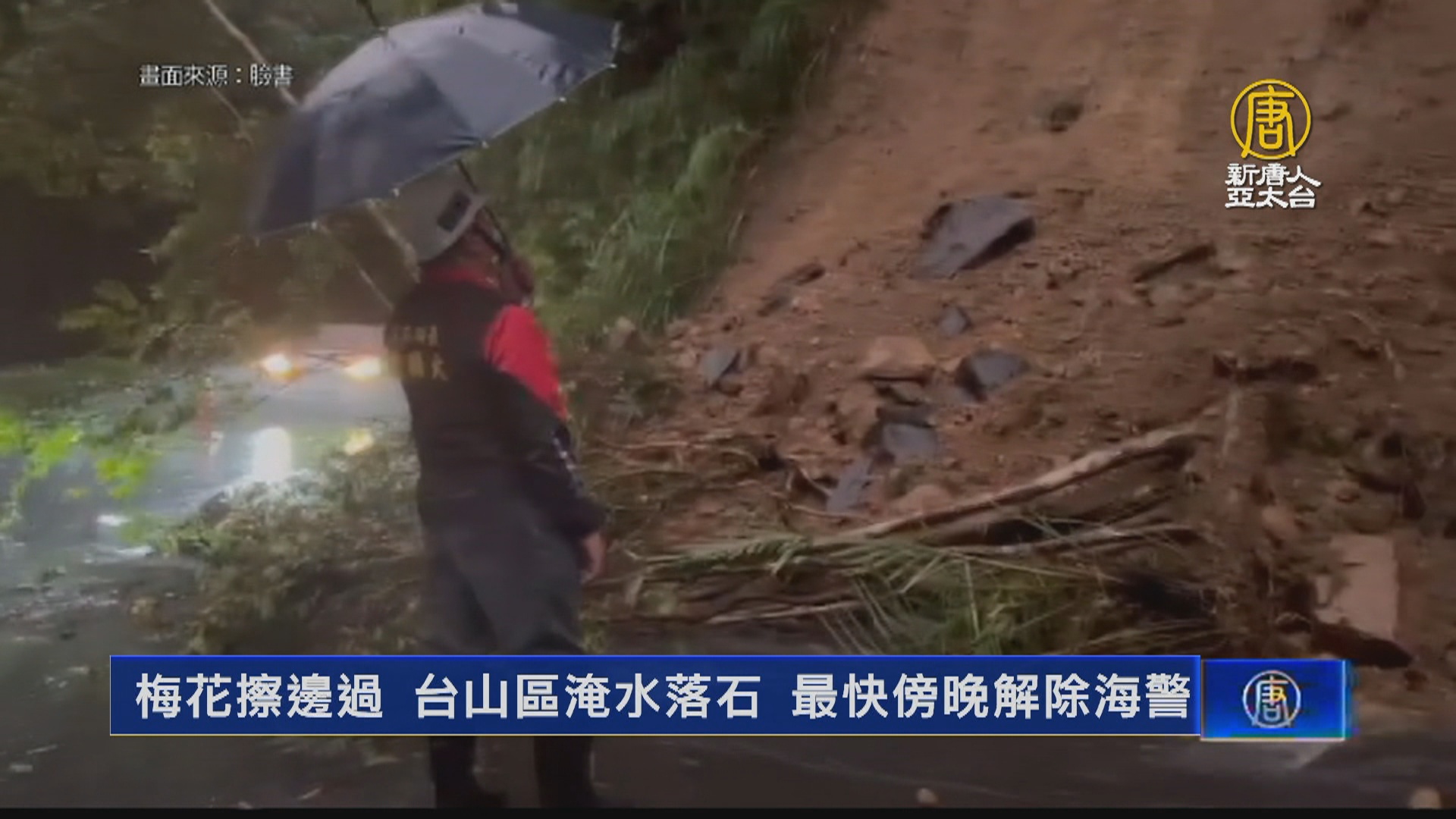 【新唐人亞太台 2022 年 09 月 13 日訊】新聞開始先來看到,梅花颱風的最新動態,目前梅花位置處於台灣東北邊,北部地區因為仍受外圍環流影響,持續有降雨,不過,氣象局預估,最快在傍晚就能解除海上颱風警報,推測梅花將朝中國沿海前進。因為梅花接近,多地出現零星災情,並影響交通。台鐵平溪線在清晨撞上巨大落石,雖然車上無旅客,不過十分到菁桐間路段一度封閉。由於該路段易受豪雨影響岩盤鬆動,基於安全考量,預估預警性封鎖到午夜,台鐵已啟動平溪線公路接駁。苗21線道路巨石崩落交通中斷。新北烏來、新竹橫山都有淹水,此外,農委會發布15條土石流紅色警戒,分布於新竹縣尖石鄉、桃園市復興區、新北市烏來區;並針對桃園市復興區華陵里、新竹縣尖石鄉秀巒村,發布大規模崩塌紅色警戒。桃園復興十個里因被列為土石流警戒區域,緊急撤離278人。