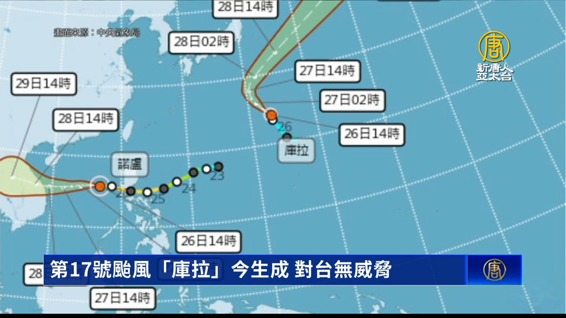 【新唐人亞太台 2022 年 09 月 26 日訊】再來看到,太平洋上目前有雙颱共舞,今年第17號颱風「庫拉」今天在硫磺島東南方海面生成,氣象專家預估對台灣及日本皆無威脅。今天北台灣白天高溫回升,但日夜溫差大,各地氣溫,北部24至33度,中部23至35度,南部23至35度,東部23至35度。目前16號颱風「諾盧」持續以偏西的方向往中南半島前進,除了為三沙群島帶來大雨,也將直接影響中國福建、廣東沿海等地,當地將現7級大風。