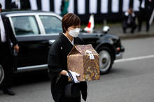 日本放送協會(NHK)報導,抱著安倍骨灰罈的遺孀安倍昭惠,下午1時26分搭乘座車從東京都澀谷區自宅出發,途中先經過安倍生前跟各國領袖舉行會談的主要舞台「迎賓館」,接著再經過負責安倍生前致力安全保障政策的防衛省,最後在1時55分抵達國葬會場。