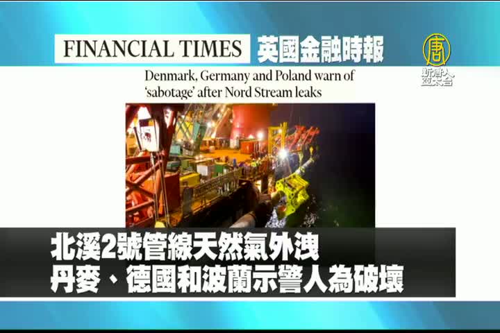 【新唐人亞太台 2022 年 09 月 28 日訊】接著是英國金融時報的報導:北溪2號管線天然氣外洩,丹麥、德國和波蘭示警人為破壞。