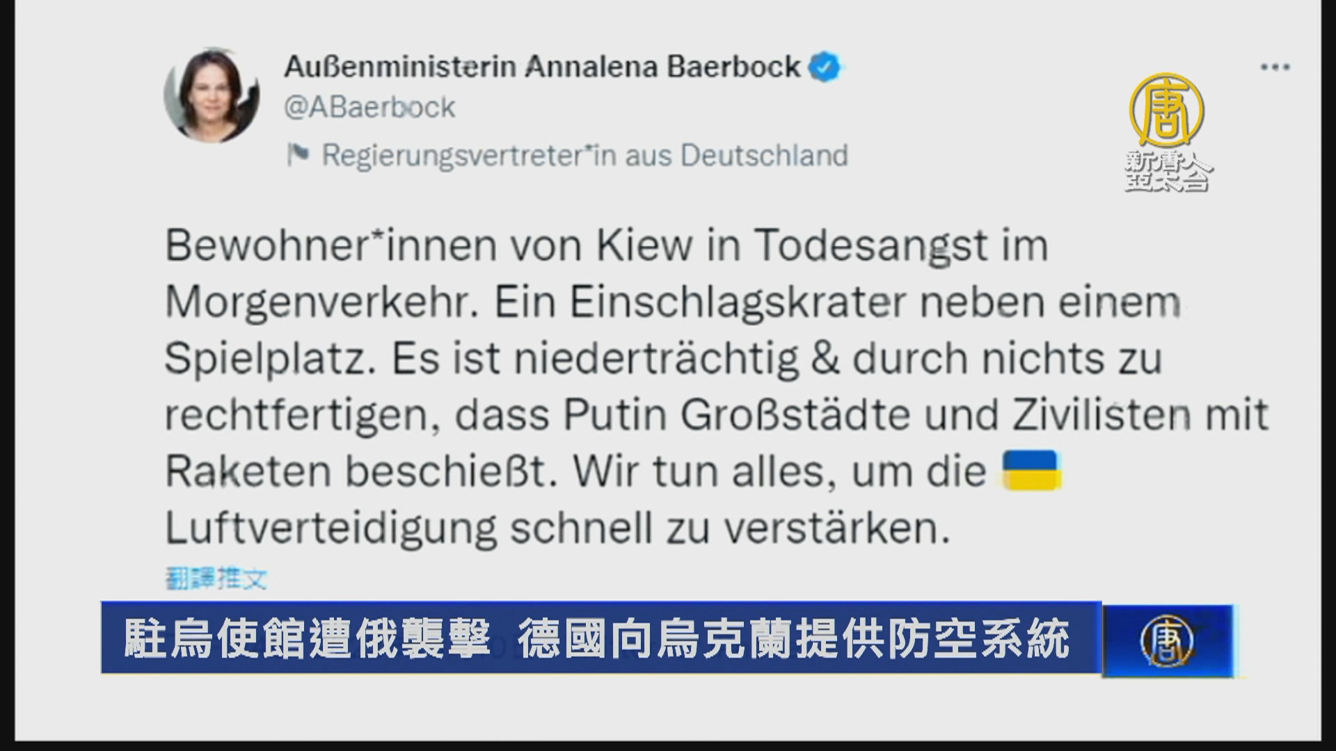 【新唐人亞太台 2022 年 10 月 11 日訊】俄羅斯對烏克蘭首都基輔,發動新一輪飛彈襲擊。德國駐基輔領事館所在的建築物也被擊中受損。襲擊發生時,沒有官員在場。自戰爭爆發以來,工作人員就不在德國駐烏大使館辦公。德國外交部長貝爾伯克(Annalena Baerbock)在推特寫道,「普丁向烏克蘭主要城市和平民發射飛彈是卑鄙無理的。正在盡一切努力加強防空」。德國國防部則表示,承諾給烏克蘭的四套IRIS-T地對空防禦系統,其中一套正在交付,最近俄羅斯對基輔和其它城市的飛彈襲擊表明,烏克蘭擁有自衛的防空能力是多麼重要。