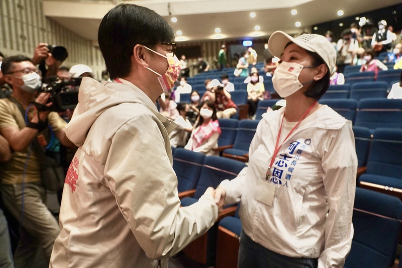 高雄市長參選人號次抽籤21日舉行,民進黨參選人陳其邁(前左)和國民黨參選人柯志恩(前右)罕見同台,兩人握手致意。(圖/中央社)