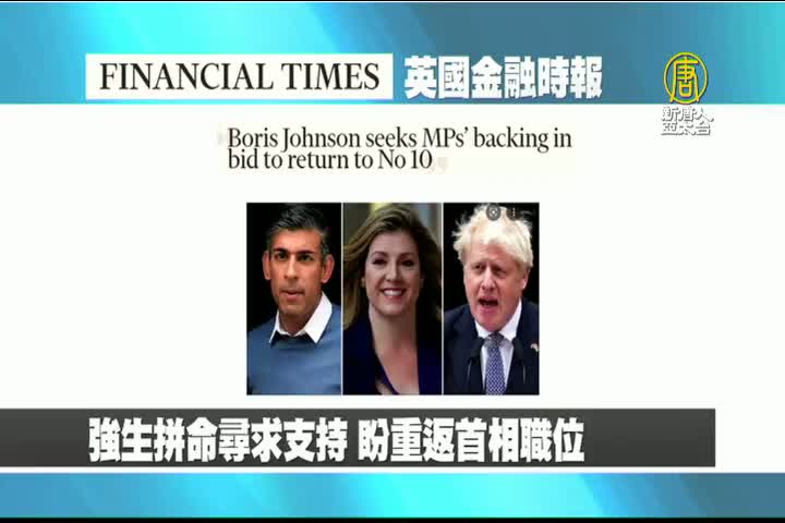 【新唐人亞太台 2022 年 10 月 24 日訊】接著是英國金融時報的報導:週日,強生拼命尋求更多保守黨議員支持試圖復出,獲得進入下一任首相英國投票所需的100個提名。