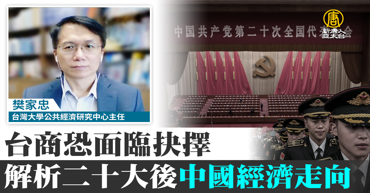 【新唐人亞太台 2022 年 10 月 24 日訊】中共二十大,確定李克強等5大財經首長失勢。新中共領導班子,基本上由習家軍主導,我們請教台灣大學公共經濟研究中心主任樊家忠教授,我們看到,中共總書記習近平,在20大提到,要實現所謂共同富裕、經濟雙循環,怎麼解讀未來中共經濟內外政策走向?對台商有何建議?