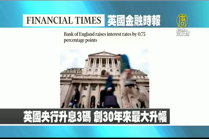 【新唐人亞太台 2022 年 11 月 04 日訊】接著是英國金融時報的報導:英國央行升息3碼,創30年來最大升幅。