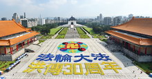 在艷陽高照下,來自全台各地五千位法輪大法學員,井然有序的走入台北自由廣場排字區,花了近兩個小時,排出「法輪」圖形及「法輪大法洪傳30周年」巨型圖像。路過的外國遊客紛紛拿起手機,捕捉這一刻。