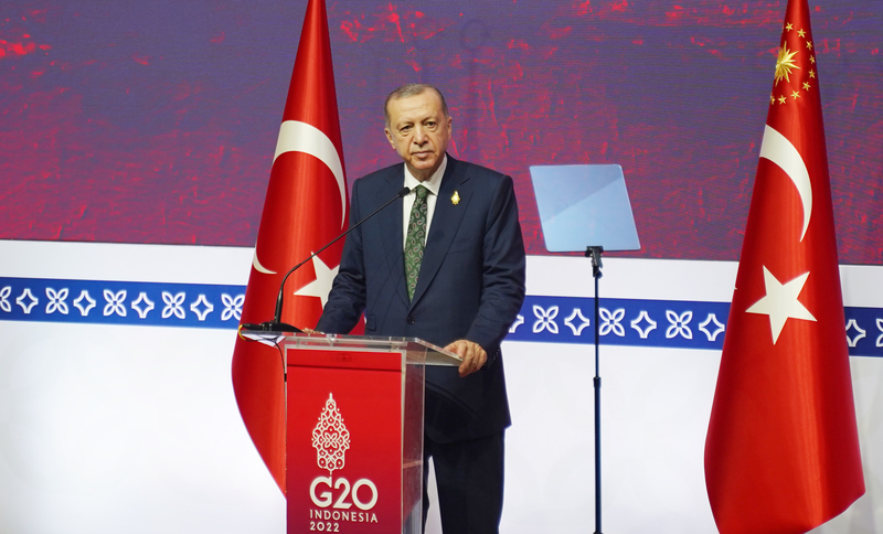 土耳其總統艾爾段(Tayyip Erdogan)16日在峇里島舉行記者會,媒體聚焦波蘭疑似遭俄羅斯發射飛彈擊中事件,向他提問土耳其立場。(圖/中央社)