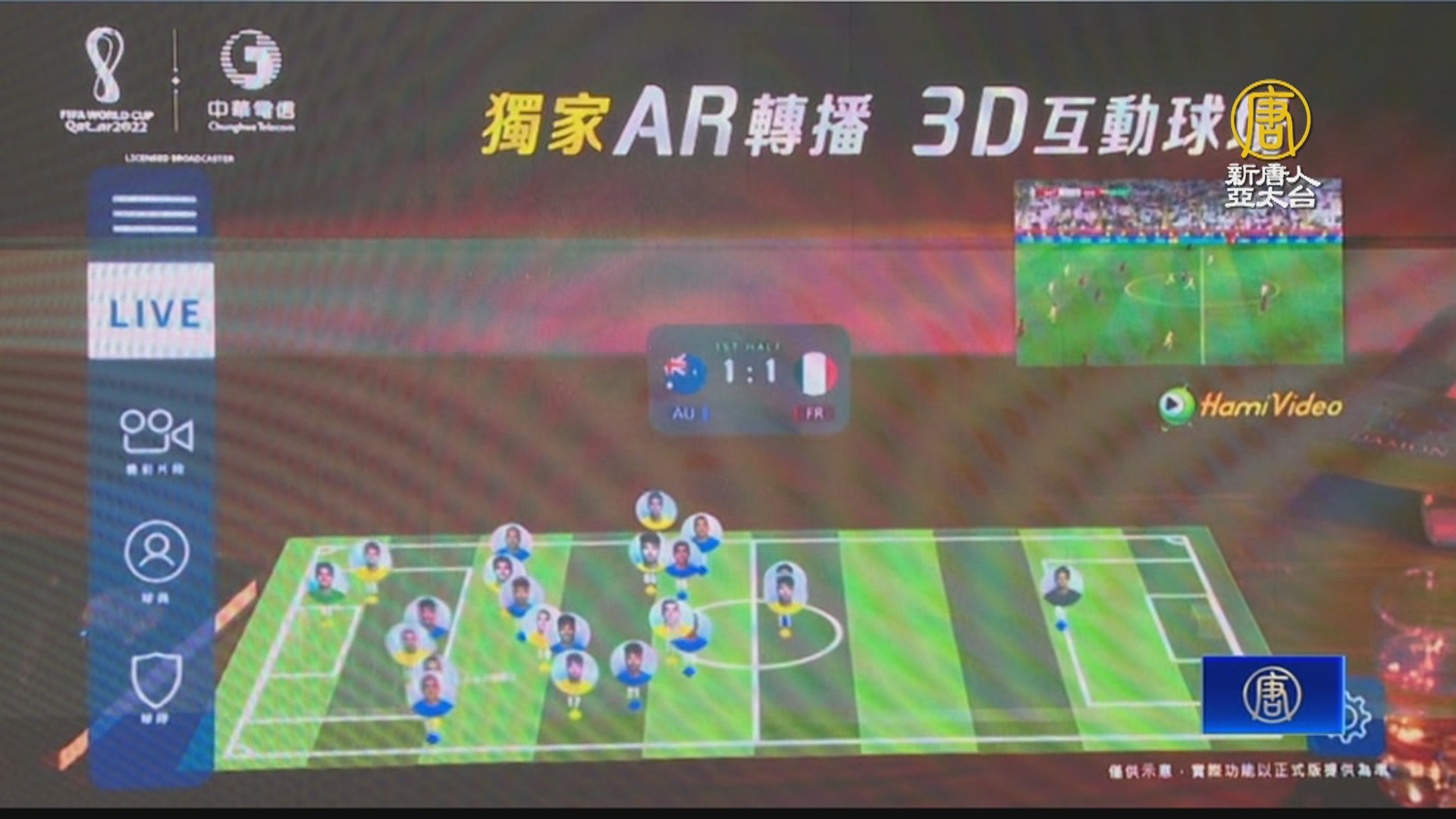【新唐人亞太台 2022 年 11 月 22 日訊】世足賽在台灣時間21日開踢,頻道業者看好世足商機,陸續推出行銷活動。台灣電信龍頭中華電信,今天(22日)在台北信義區舉行直播派對,邀請球迷一起觀賽。總經理蘇添財表示,這一屆的世足賽台灣首度啟用AR轉播,也象徵台灣影視產業正式進入AR直播里程碑。預計流量會較上屆成長3倍。
