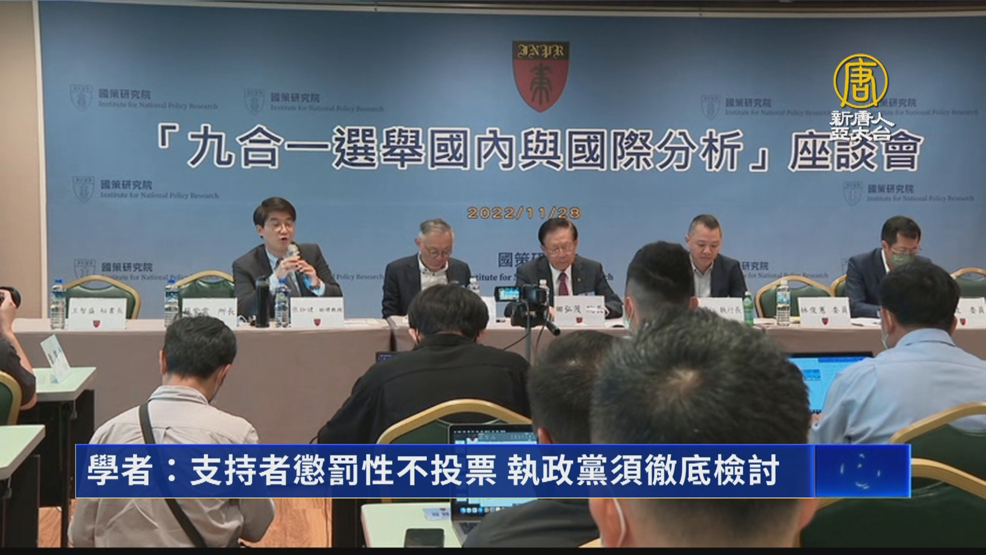 【新唐人亞太台 2022 年 11 月 28 日訊】台灣九合一大選,國策院周一(28日)座談會,學者分析,執政黨敗選主因是歷史性低落的投票率,在野黨支持者報復性的投票,執政黨支持者懲罰性的不出來投票。執政黨國會議員表示,需要走出同溫層深入檢討。