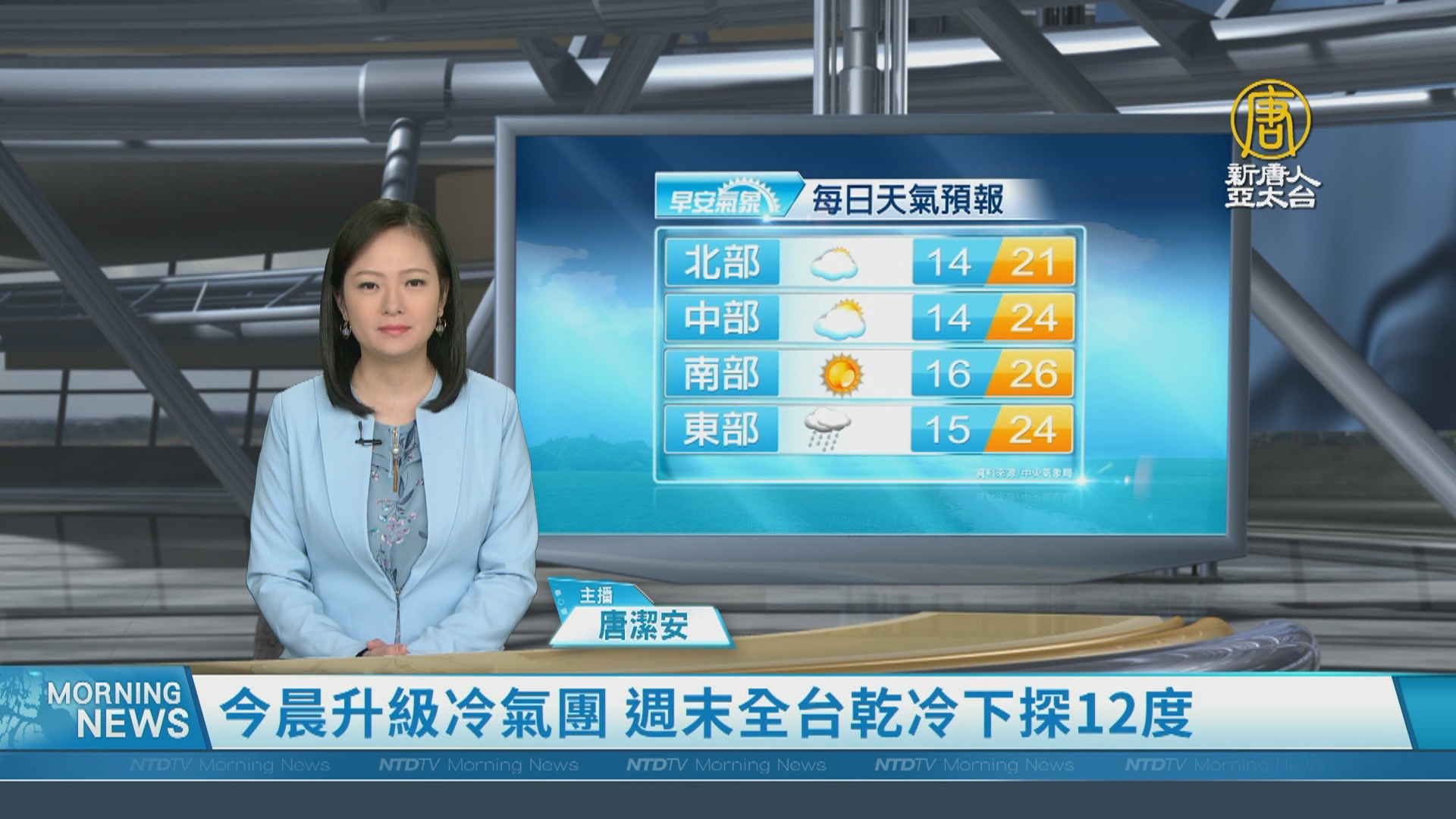 【新唐人亞太台 2023 年 01 月 04 日訊】歡迎您收看1月4日的早安新唐人,我是唐潔安,先來帶您關心天氣。今天(4日)清晨台北氣象站降到14.4度,達到冷氣團標準。氣象局也對基隆市、新北市、宜蘭縣發布大雨特報。預計,中南部週四之後將放晴、北台灣則是週末假日才會見到陽光。不過,全台要留意輻射冷卻造成的低溫,西半部低溫平均約14到15度,西半部局部空曠地區要留意12到13度的低溫,帶您一起來看到國際媒體重要訊息。